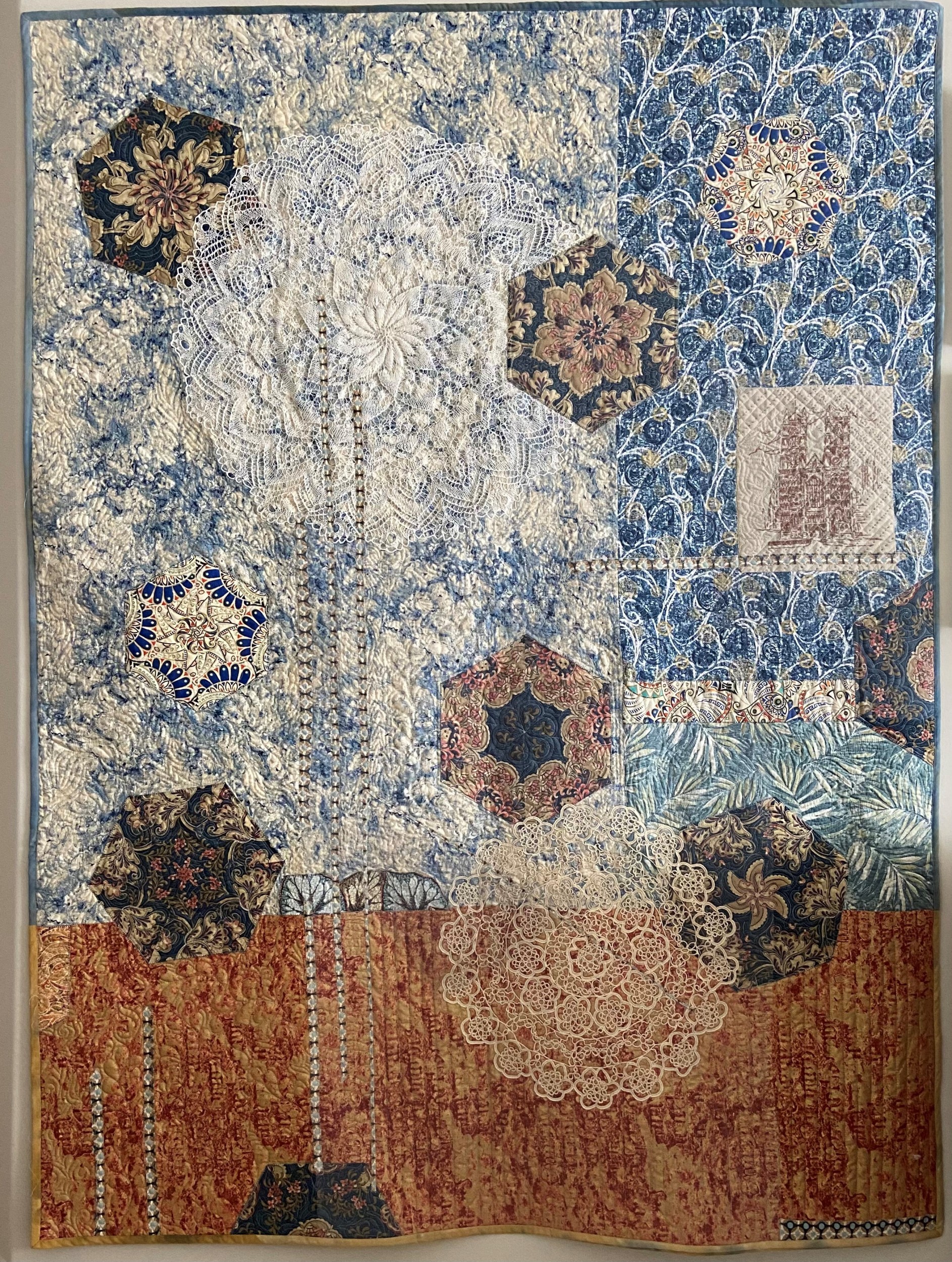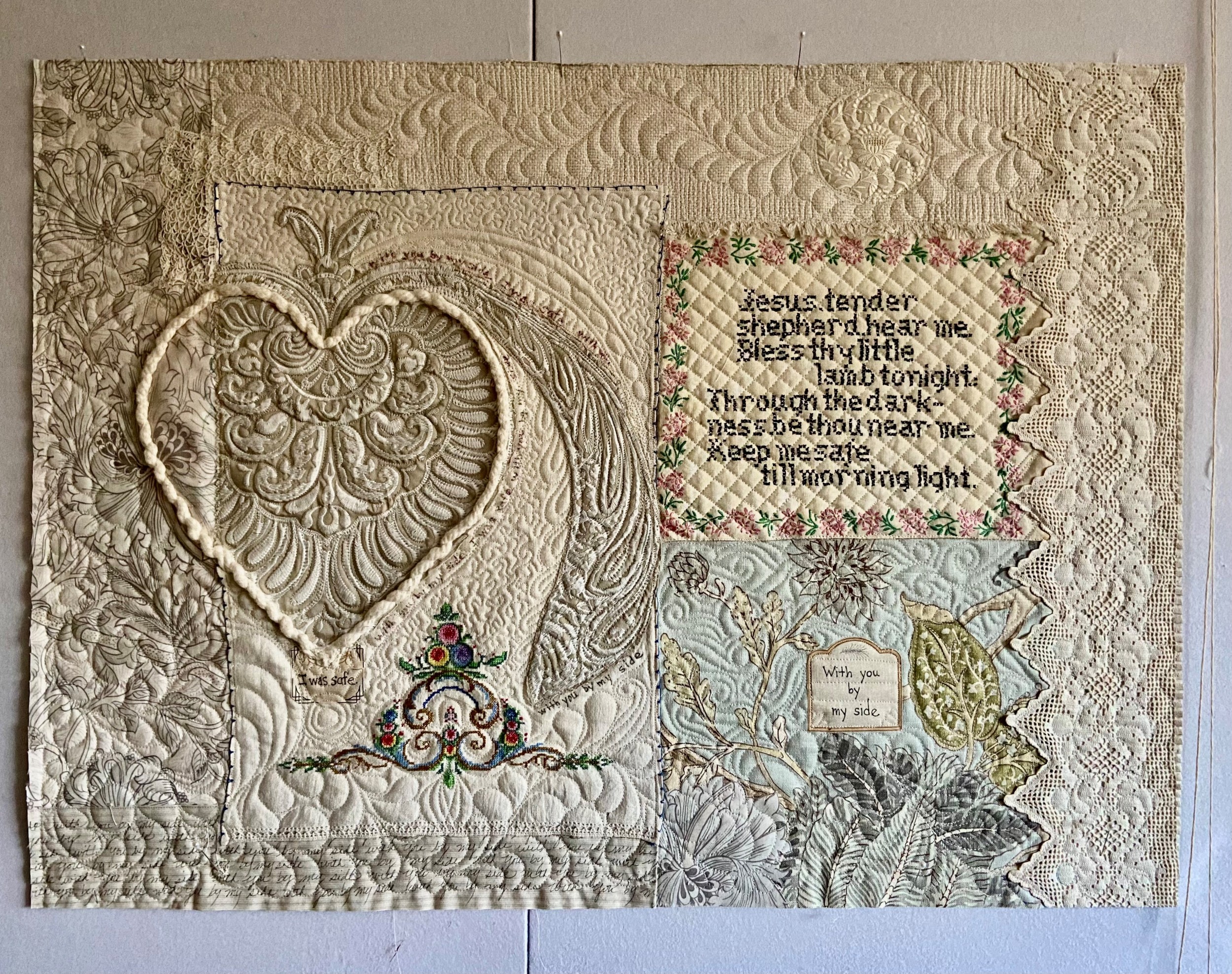 Lamentation and Celebration explores grief and loss in the midst of life's beauty. This series of collaged works employ found needlework fragments, carrying forward the stitches of women working in traditional craft to the galleries of the present, adding a dimension of time and nostalgia to Lois' works.