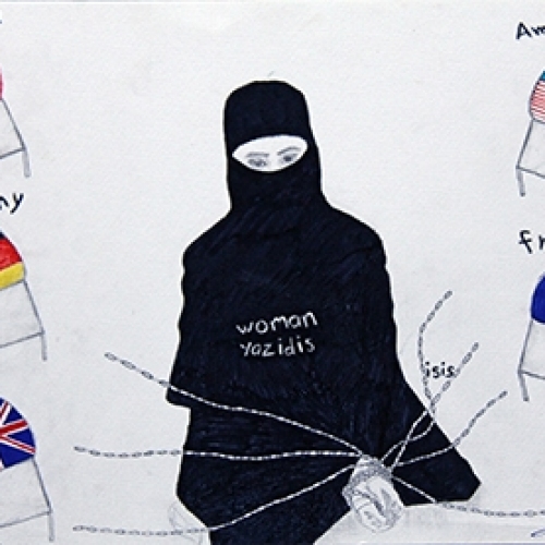 Kathy Moohhead Thiessen, working with a Christian Peacemaker Team (CPT), began the search for people willing to share their story. Soon works of art from Iraqi Kurds, Syrian Kurds, Yazidis, Assyrian Christians and Iraqi Arabs began to arrive at the CPT house.