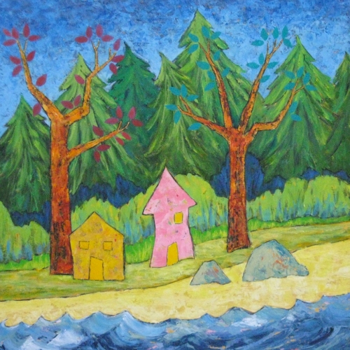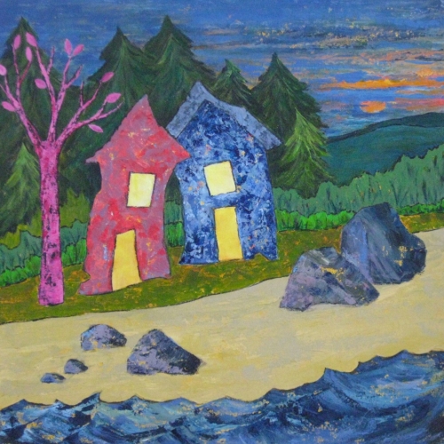 In this exhibit by Jane Gateson, eleven paintings tell the whimsical and allegorical story of a little house as it grows up and journeys through life. Eleven matching abstract paintings reveal the inner life of the house.