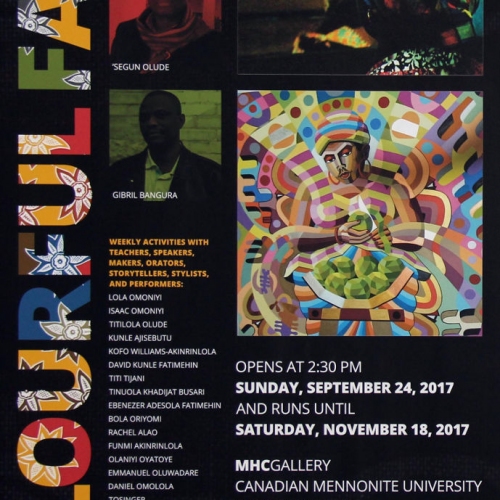 Colourful Faith is the brainchild of Winnipeg artist and educator ’Segun Olude. The exhibit includes his original photographs and creations based on a book on Yorùbá life he has written and designed. Paintings by Gibril Bangura will also be featured, as will contemporary paintings Olude has collected in Nigeria.