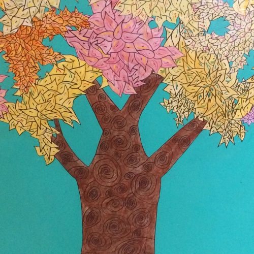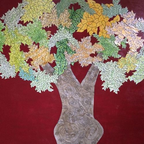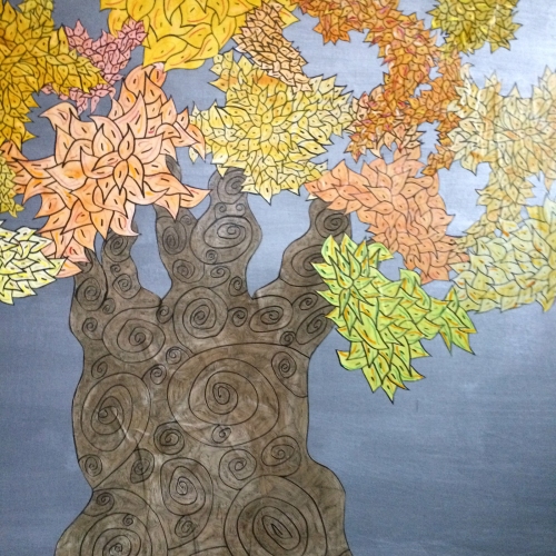 Frank Livingston's artworks are a response to the loss of trees in his neighbourhood. He says, "Ulmeus Communitas/Elm Community" began as a series of street art interventions – wheat pastes of trees – in Winnipeg's Wolseley neighbourhood. Motivated by a desire to commemorate the loss of historic elm trees (from Dutch Elm Disease) I sought to reflect on this organic demise with representational trees. The sites I chose for the placement of these trees were the abject and benighted surfaces that populate our neighborhoods such as dumpsters, signal boxes and transformer boxes. Each wheat paste tree was drawn by hand in sections with separate trunks and clusters of leaves that would form the canopy. The trunks and leaves were filled with stylized design elements, many of them geometric, rendered with permanent marker, which re-inscribes the built and constructed nature of trees and landscape. Painted with watercolour in a range of green hues, autumnal yellows, oranges, pinks, and reds the leaves were applied separately.