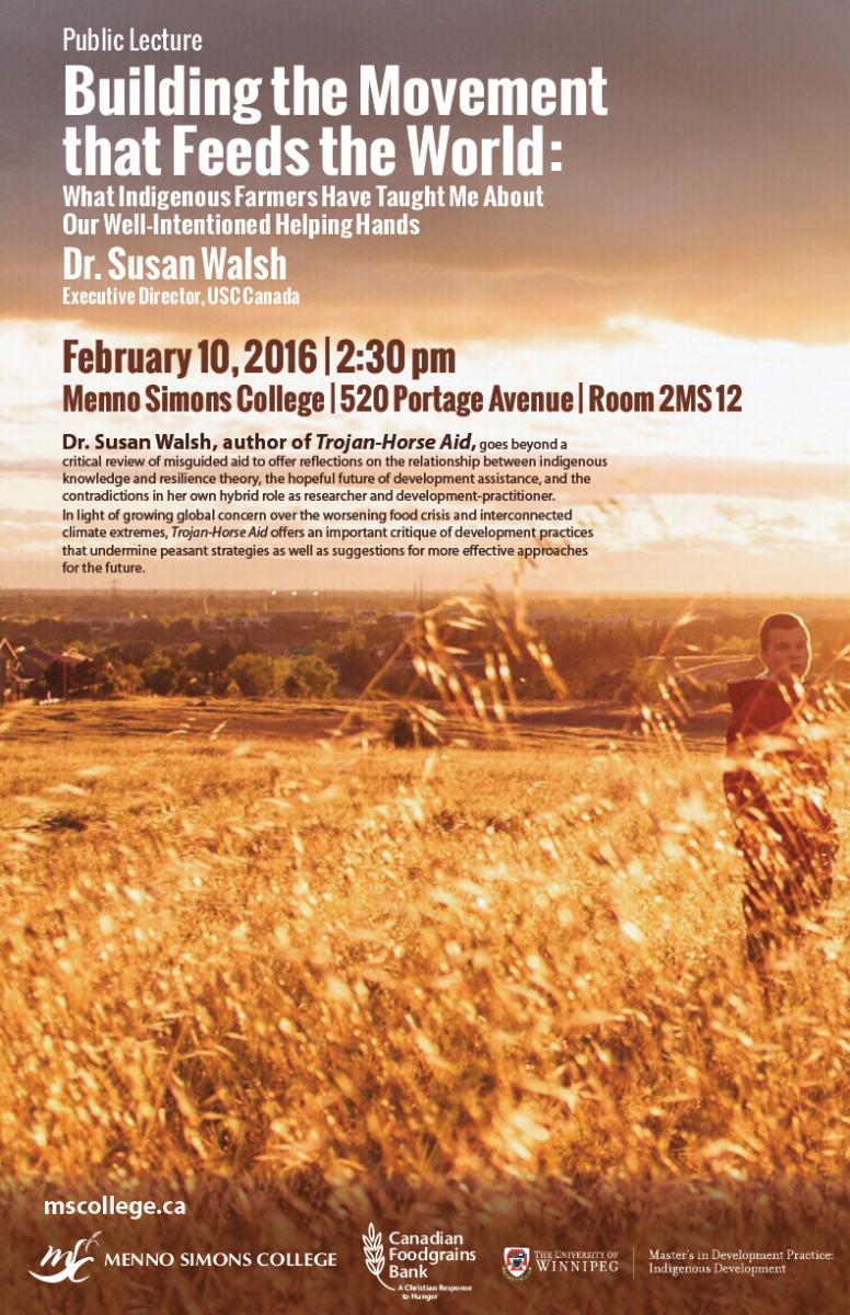Menno Simons College is pleased to present the public lecture "Building the Movement that Feeds the World: What Indigenous Farmers Have Taught Me About our Well-Intentional Helping Hands," featuring Dr. Susan Walsh, Executive Director of USC Canada.