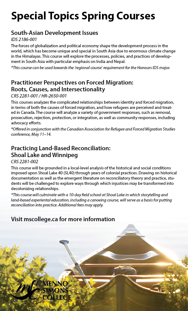 This course will be grounded in a local-level analysis of the historical and social conditions imposed upon Shoal Lake 40 (SL40) through years of colonial practices. Drawing on historical documentation as well as the emergent literature on reconciliatory theory and practice, students will be challenged to explore ways through which injustices may be transformed into decolonizing relationships. This course will culminate with a 10-day field school at Shoal Lake in which storytelling and land-based experiental education, including a canoeing course, will serve as a basis for putting reconciliation into practice. The course will meet on campus Mondays and Wednesday, May 2–30, and June 13–27. The field course will run May 31–June 10. Students must receive permission of instructor to register.